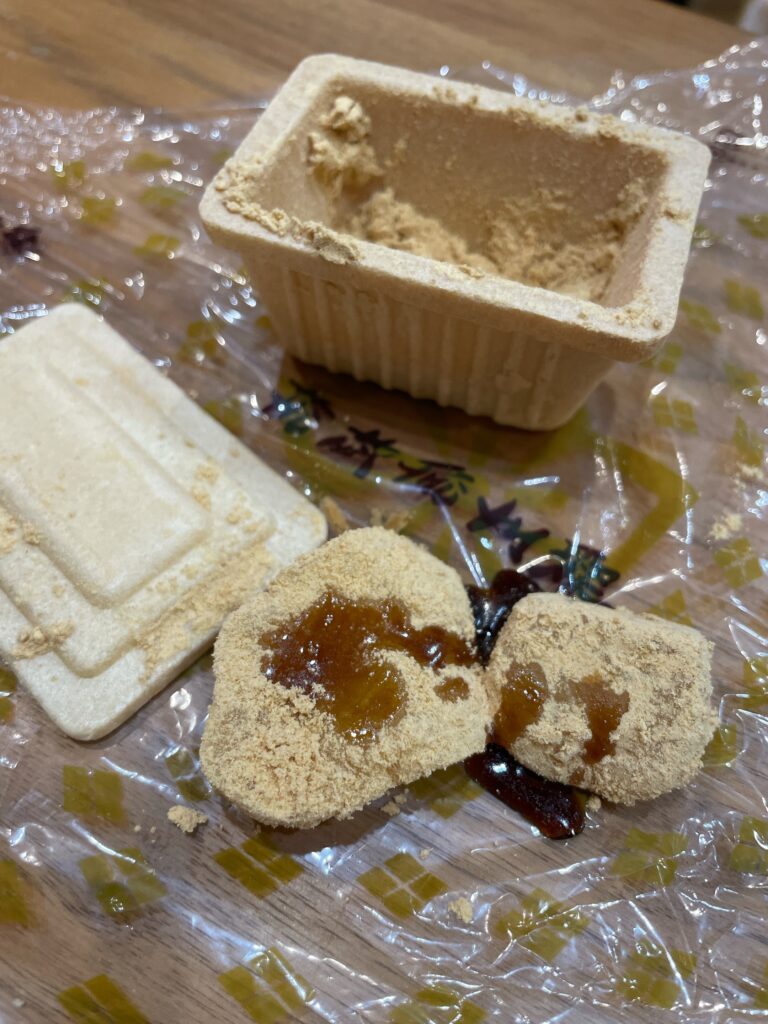 信玄餅だけど…? uncategorized Twitter Facebook はてブ Pocket LINE コピー 2025.11.11 お土産でおなじみ信玄餅!! 袋を開けると…!? なんと!! 外側が、もなかなんです!! いつもプラスチックのケースに入っているものだったから、画期的でびっくり!!! 黒みつボトルの窪みもちゃんとある♩ 開けると・・・ きな粉がもりもり!!いえーい! 袋の上に、餅を出して 黒蜜をかけていただきました!!美味しかったー!!もちろん、もなかもね! 子どもの時から、余ったきな粉を牛乳に溶かして飲むのが好きです。 いつか工場へ行ってみたい・・・
