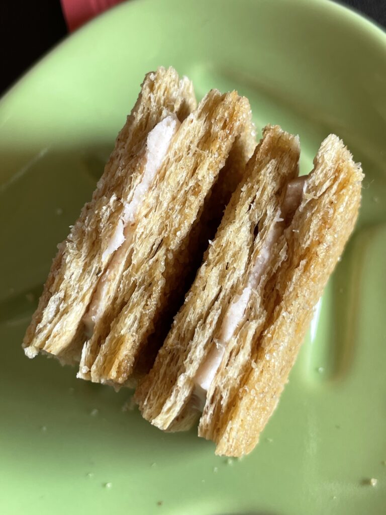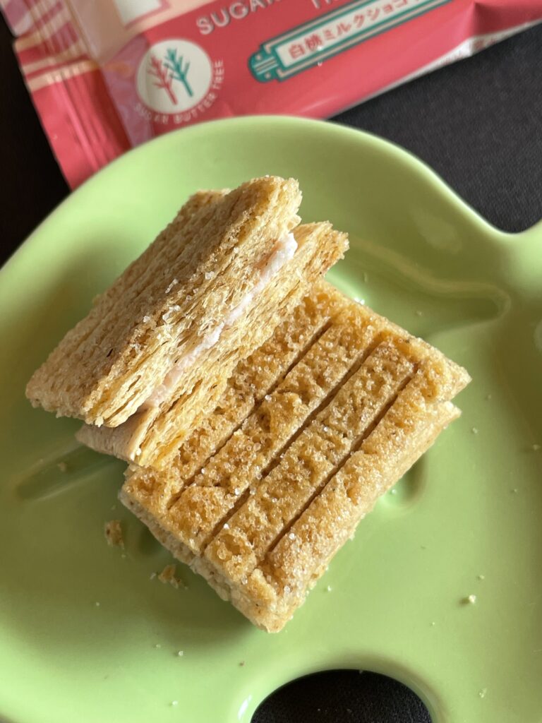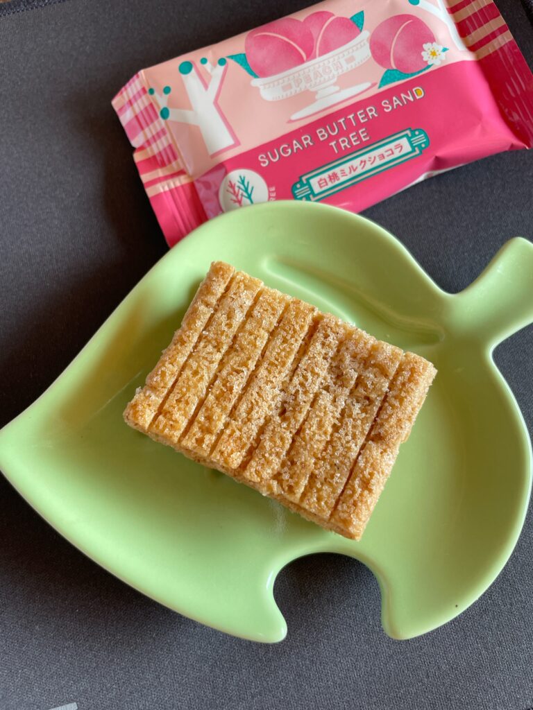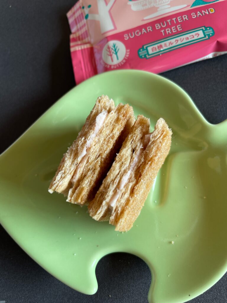 白桃ミルクショコラ お土産 Twitter Facebook はてブ Pocket LINE コピー 2025.12.29 シュガーバターサンドの木 今回は、 『白桃ミルクショコラ』だよ~!! 包装も、ピンクで可愛らしい! 2025年4月~9月ごろまでの夏季限定商品でした。 この、パイの層が何重にもなっているのが見ごたえある!! サクサク感が伝わってくるね 白桃の風味がしっかり感じられて、少し甘酸っぱいかな。美味しかったよ~♪